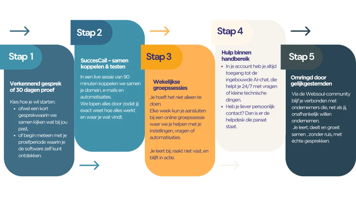 Toch blijft dat voor veel ondernemers het moeilijkste deel: de vertaalslag maken van inzicht naar actie. Daarom is Websoul niet enkel een systeem, maar een proces dat met je meegroeit.